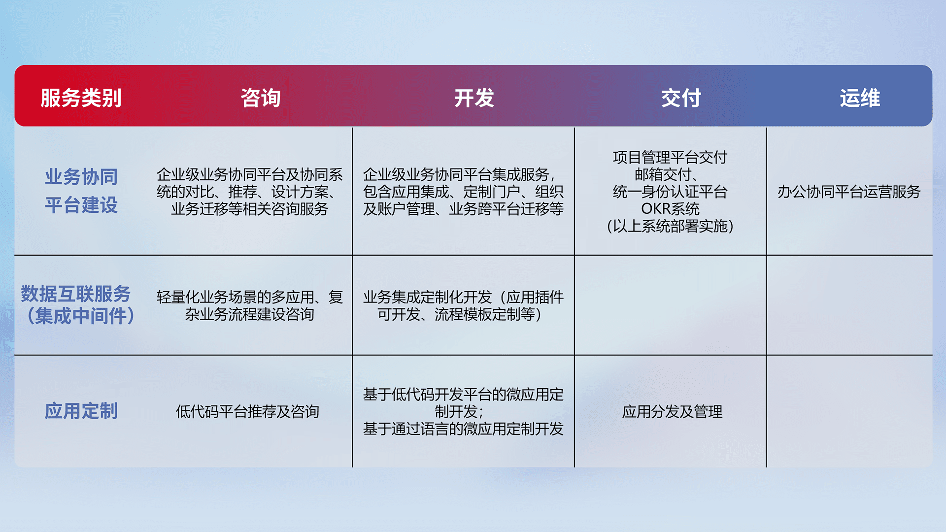 针对钉钉、、企微、、、、IDaas等平台级产品提供产品的规划、、、、方案、、交付、、、定制化开发等服务,,,实现如统一协同办公、、、智能客户服务、、、混合会议管理、、智能数据查询、、等业务场景,,,,实现数字化转型。。